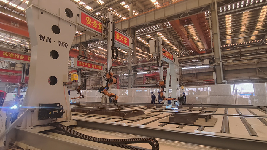 以數(shù)據(jù)驅(qū)動為核心,智昌集團(tuán)為船舶行業(yè)構(gòu)建了涵蓋智能焊接、物流、調(diào)度與決策支持的一體化系統(tǒng)。智能焊接部分采用具備3D視覺智能機(jī)器人,實(shí)現(xiàn)對焊縫的自動識別與高精度路徑規(guī)劃。物流系統(tǒng)通過多臺重載RGV與桁車協(xié)同,配合首創(chuàng)的力感仿手翻板機(jī),完成大型工件的自動輸送與安全翻轉(zhuǎn)。調(diào)度系統(tǒng)與集團(tuán)生產(chǎn)平臺實(shí)時對接,驅(qū)動信息化分揀與配送機(jī)制,應(yīng)對多品種物料的精準(zhǔn)管理。數(shù)字孿生平臺將物理產(chǎn)線全要素映射至虛擬空間,實(shí)現(xiàn)全過程可視化監(jiān)控與數(shù)據(jù)聯(lián)動。此外,基于行業(yè)工藝數(shù)據(jù)訓(xùn)練的工業(yè)大模型,為操作人員提供實(shí)時輔助,推動知識經(jīng)驗(yàn)的結(jié)構(gòu)化沉淀與傳承。